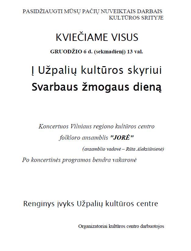 Primename, kad 2015 m. lapkričio 27 – 28 d. Užpalių bibliotekos patalpose rengiamas „Padėvėtų rūbų turgelis“. Maloniai kviečiame atvykti ir įsigyti Jums reikalingų drabužių, kurie bus pardavinėjami už simbolinę kainą (0,50 -2,00 Eur.), o surinkti pinigai bus pradinis įnašas kaupiant lėšas kilnojamos scenos įsigijimui, kurios mums visiems labai reikia organizuojant renginius miestelyje.