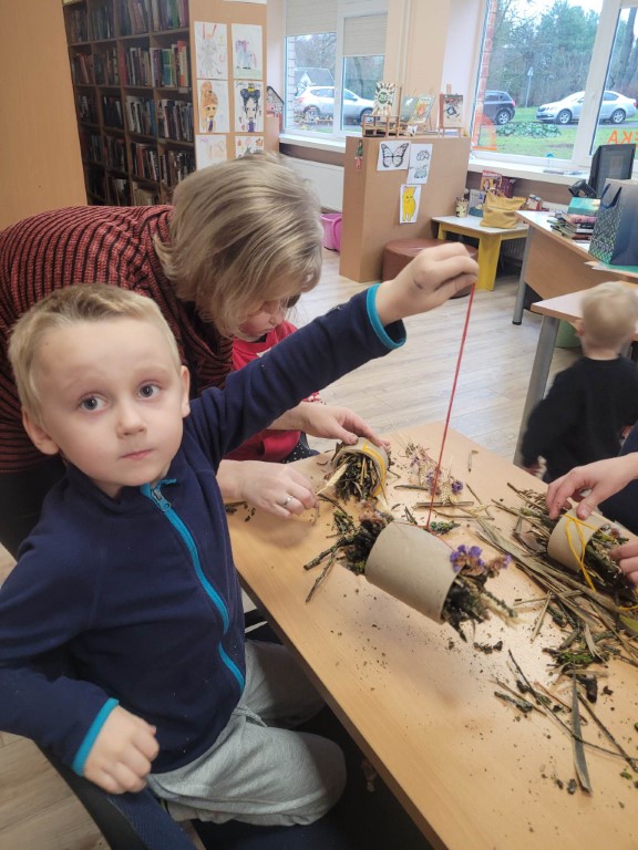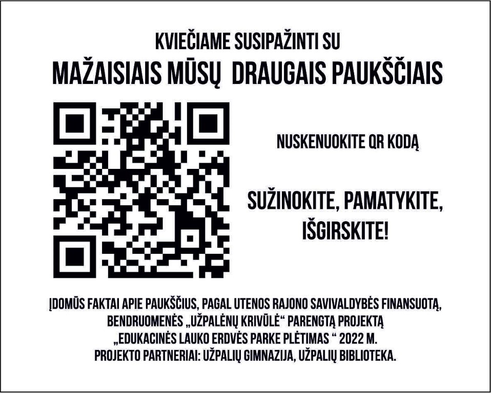 Įgyvendindami projektą edukacinei lauko erdvei parengėme du informacinius stendus apie paukščius ir 12 QR kodų apie paukščius, gyvenančius mūsų regione. Surengėme edukacines vabzdžių viešbučių gaminimo dirbtuves ir edukacinį užsiėmimą “Vabzdžiai ir paukščiai liaudies kūryboje”, išleidome „Už palių” laikraščio numerį.